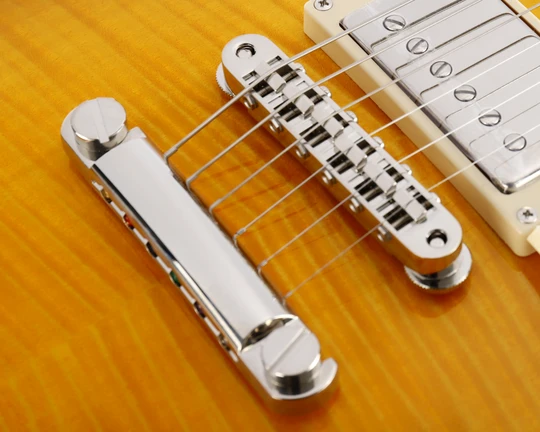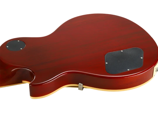 Su cuerpo de caoba africana en dos piezas recibe una tapa de maple de 15 mm —con una espectacular veneer AAAAA Flame en la versión Honey Lemon Flame— que realza la respuesta acústica y la proyección natural. El mástil en caoba con varilla de carbono, unido en set-neck con un ángulo de 14°, maximiza el sustain y la transferencia de vibración.