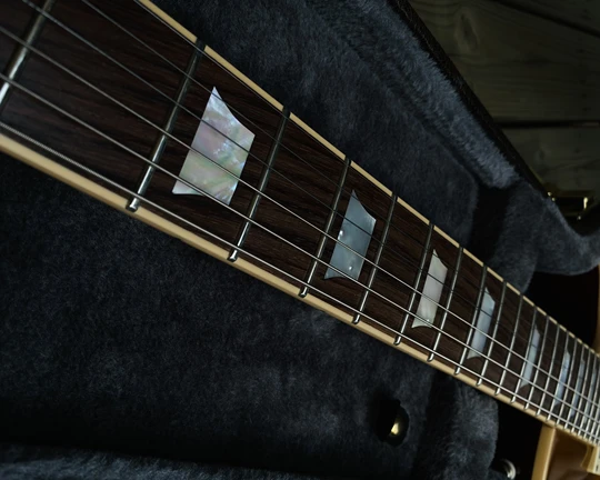 El perfil Shijie C Slim ofrece una comodidad moderna: rápido, estable y con acceso fluido incluso en los registros altos. A esto se suman incrustaciones de white butterfly shell, un diapasón de rosewood impecable y trastes US-made de níquel plata que garantizan una sensación precisa y musical.